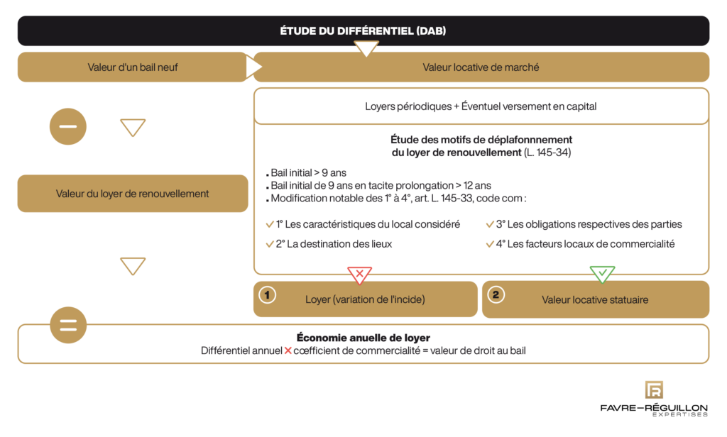 Le droit au bail (DAB), sous sa forme pécuniaire, est le prix moyen qu’un locataire sortant de murs commerciaux est susceptible de retirer de la cession de son bail à un successeur entrant.