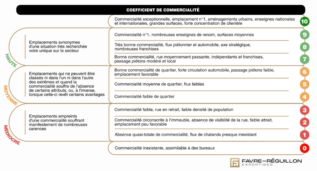 La valeur du droit au bail comprend l’importance de la situation attachée au fonds. Cette notion, depuis toujours appelée l’achalandage est désormais qualifiée de commercialité. Elle se mesure grâce à des coefficients qui ont évolué dans le temps, passant d’une logique première de « capitalisation » de l’économie de loyer réalisée par le preneur pour finalement s’affranchir totalement de toute logique financière (v. à ce sujet nos publications : « Valorisation du droit au bail : du coefficient de capitalisation à une grille de lecture contemporaine du coefficient de commercialité », AJDI nov. 2018). Il est désormais pris en compte un coefficient de commercialité :